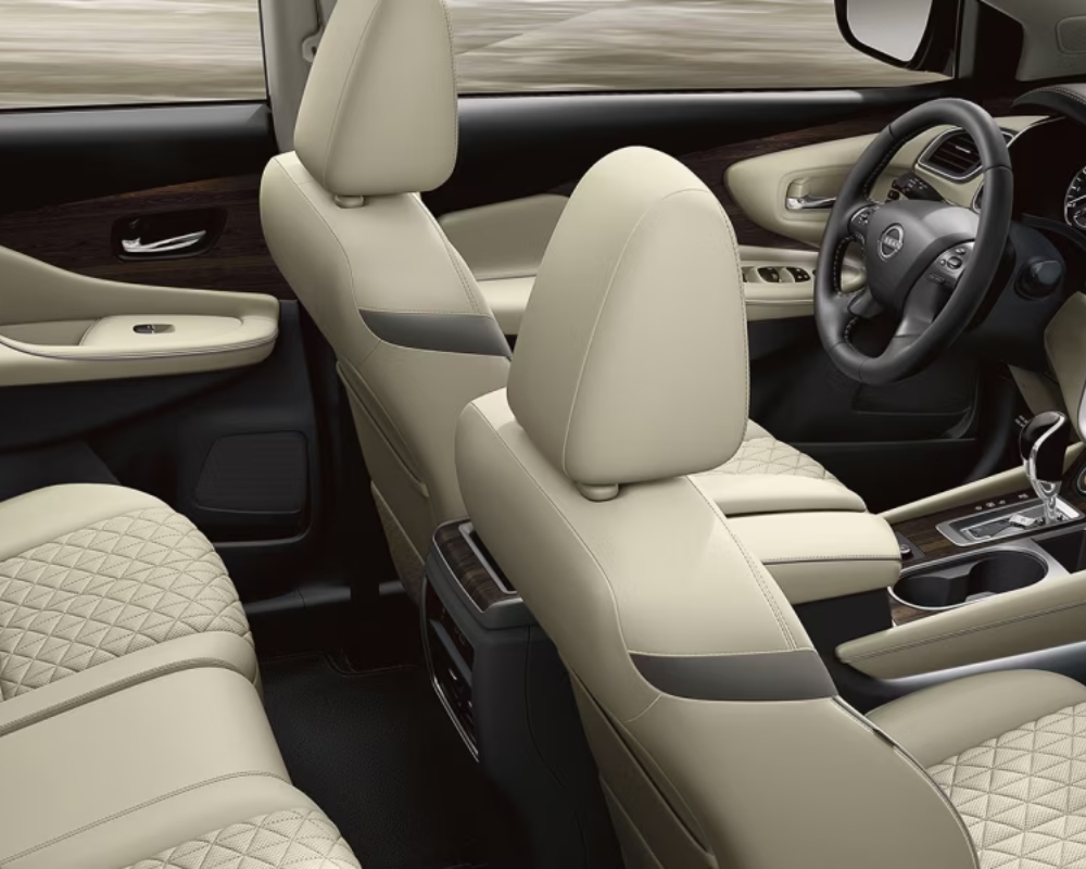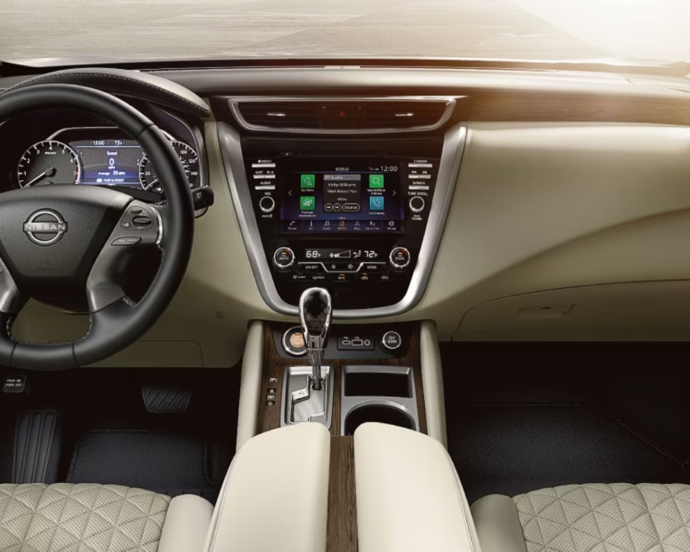 The Muranoโs interior is a sanctuary of comfort and luxury. With seating for five, the cabin features available semi-aniline leather seats and dark wood-tone accents, creating an atmosphere of premium relaxation. The Dual Panel Panoramic Moonroof floods the space with natural light, enhancing every drive. Cargo capacity is generous, with up to 1,841 litres available, ensuring that your lifestyleโs demands are effortlessly met.